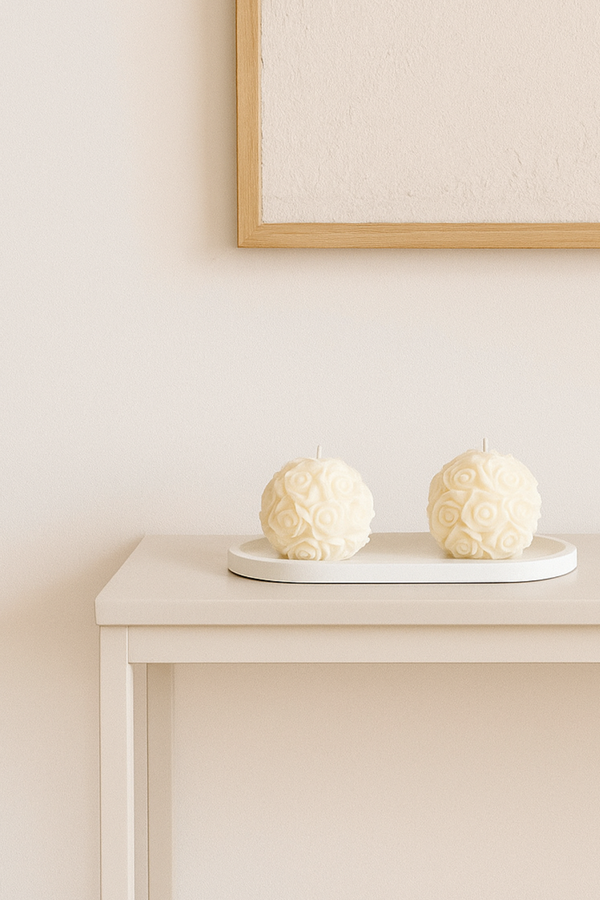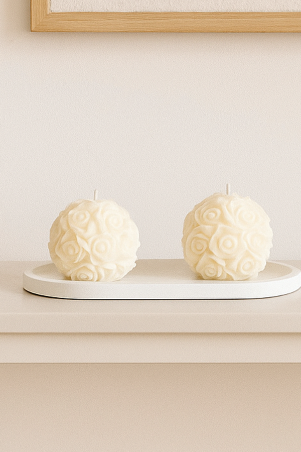 Este elegante set incluye dos velas de cera orgánica , diseñadas en forma esférica con delicados relieves de rosas, acompañadas por una bandeja contenedora minimalista que realza su presencia en cualquier ambiente.