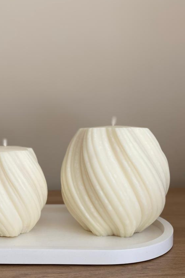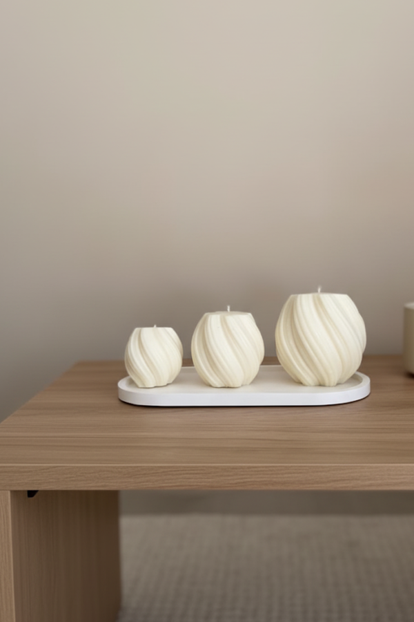 Este elegante set incluye tres velas de cera orgánica, diseñadas con delicadas curvas, acompañadas por una bandeja contenedora minimalista que realza su presencia en cualquier ambiente.