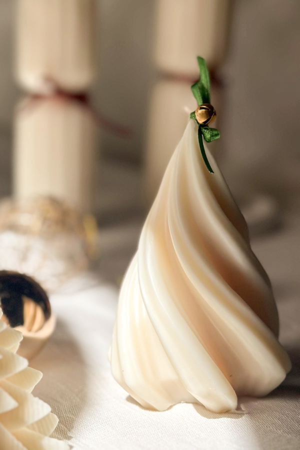 Una pieza única para iluminar tus fiestas. Nuestro árbol navideño individual está confeccionado a mano con cera de soja orgánica y un delicado blend aromático que evoca calidez, tradición y hogar.