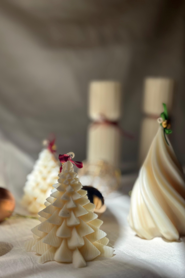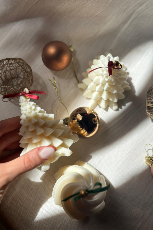 El Box Bosque de Navidad incluye tres velas con forma de árbol, en dos diseños exclusivos, creados en edición limitada para estas fiestas. Cada pieza está vertida a mano en cera de soja orgánica y perfumada con un blend aromático que evoca hogar, abrigo y celebración.